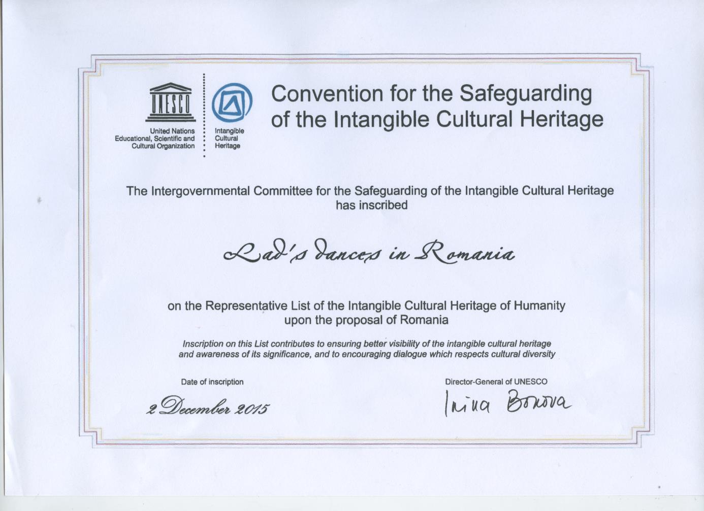 Iată şi Certificatul primit de la UNESCO, emis pe 2 decembrie, 2015: